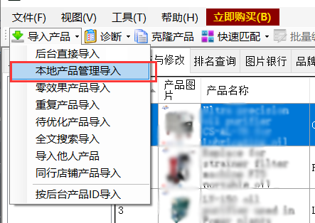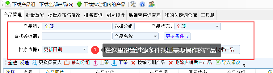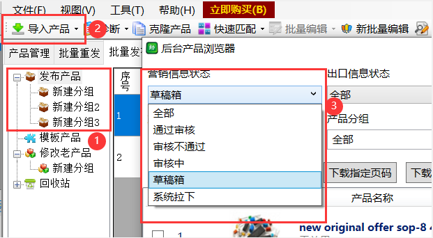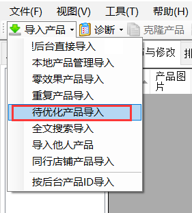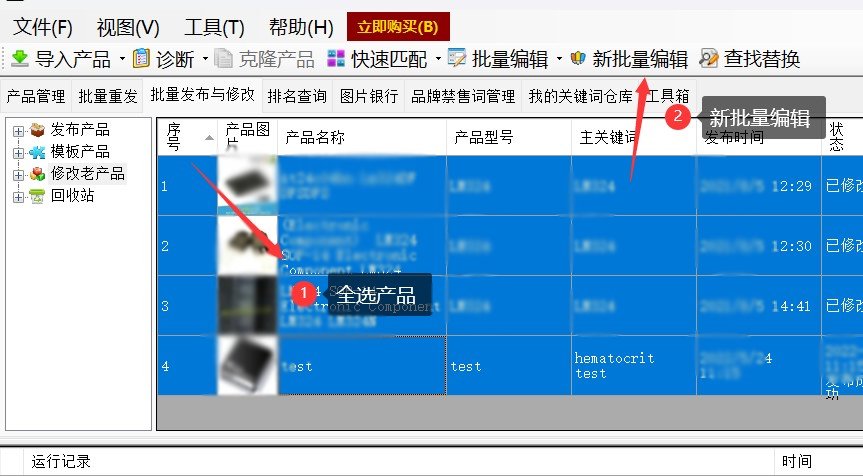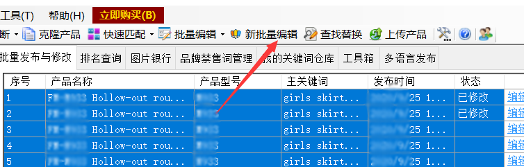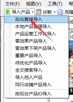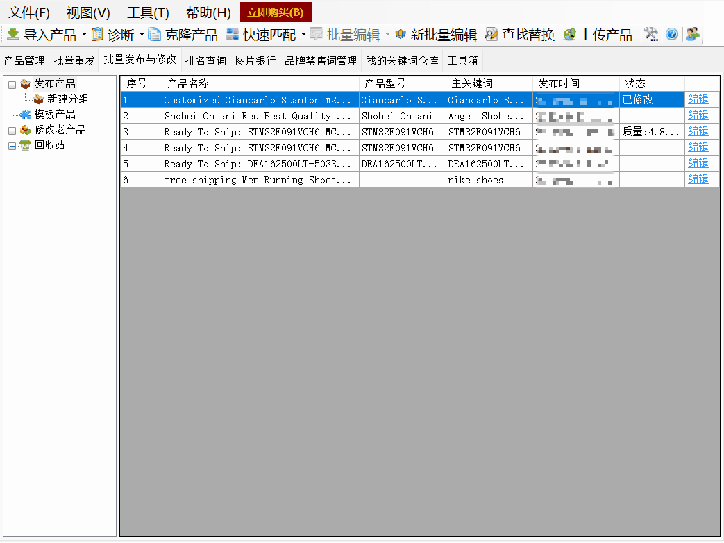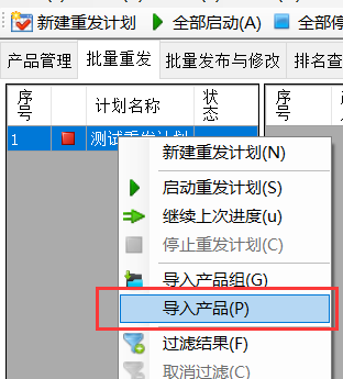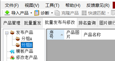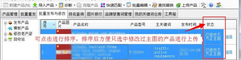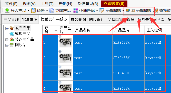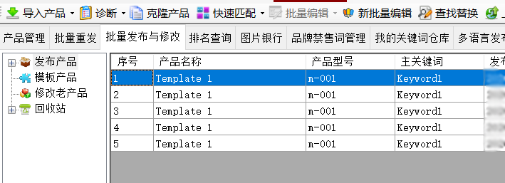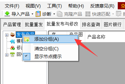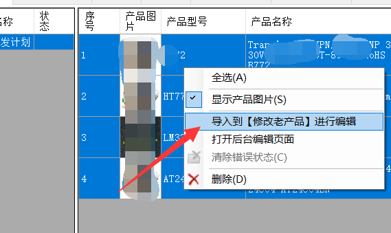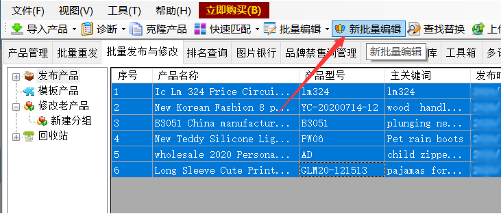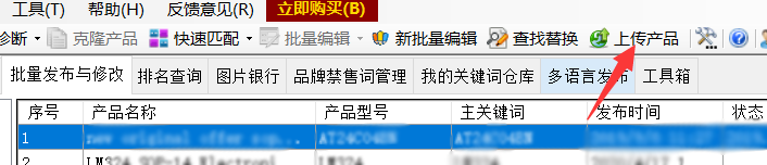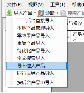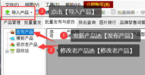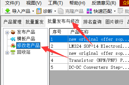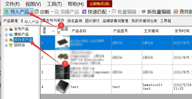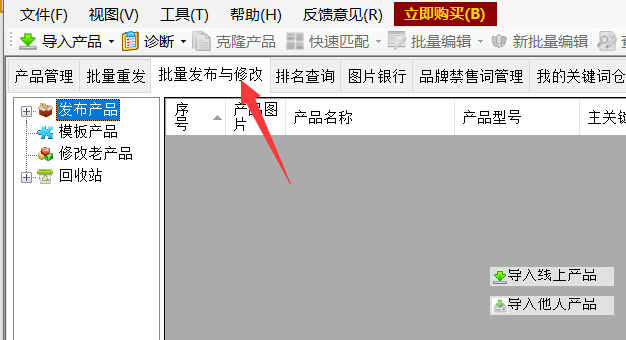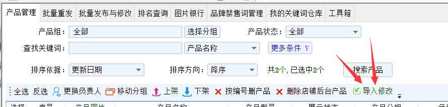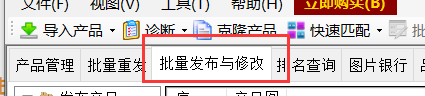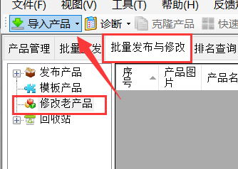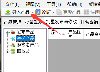 第一步:界面切换到批量发布与修改,选中模板产品点击 导入产品。