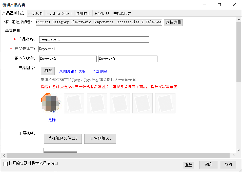 如果还需要在其他地方插入关键词或标题什么的,只需要依些类推输入占位符就可以了,编辑完成后点击【确定】 保存就完成了模板产品的编辑。