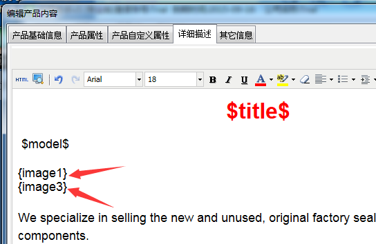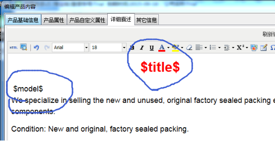 比如详细描述想在第一行位置插入每个产品各自的标题,在第2行想插入各自的型号,那么我可以用$title$表示标题,用 $model$表示型号,编辑完成的详细描述模板如图所示: