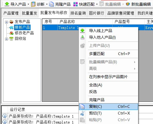选中要复制的产品模板,点击弹出右键菜单,选择复制。