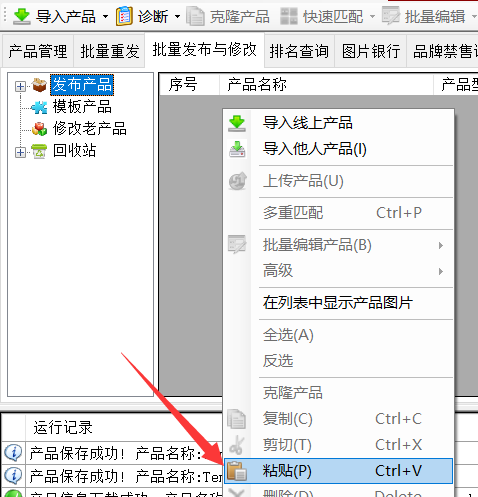 选中发布产品,在右侧灰色的区域点击右键弹出菜单后选择粘贴。