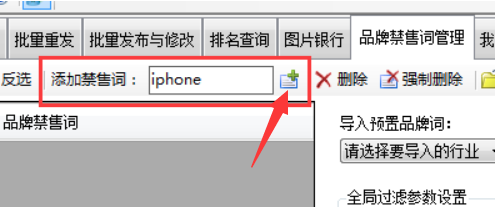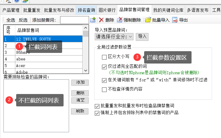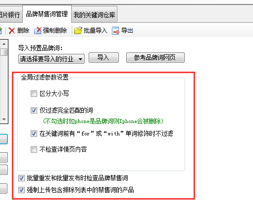 [warning]使用过滤禁售词功能需要先在品牌禁售词管理模块中添加品牌词以及设置匹配参数,详细方法请参阅【品牌禁限售词管理 】;
