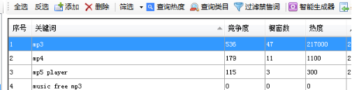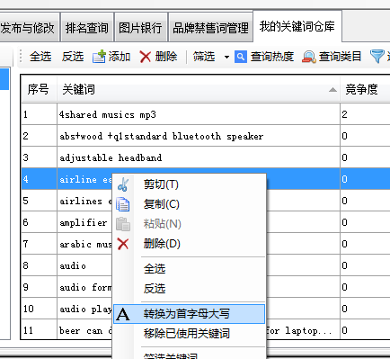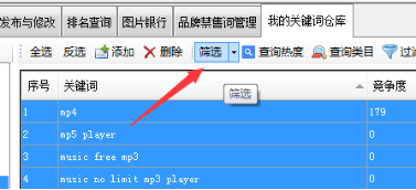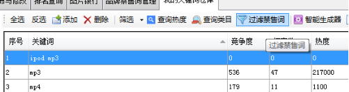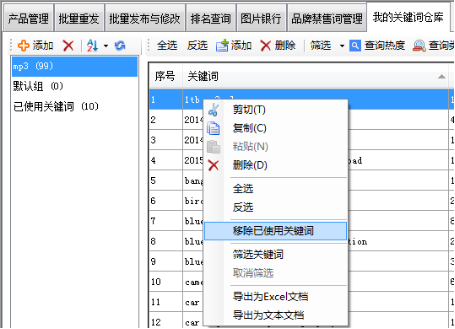 一、选中要过滤的关键词组mp3,在产品列表上点右键,点击移除已使用关键词