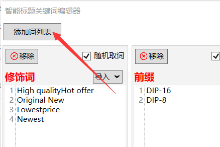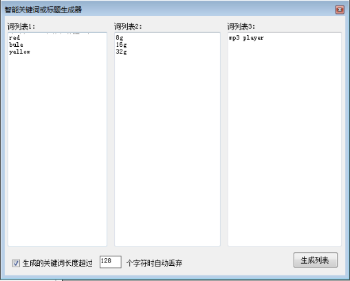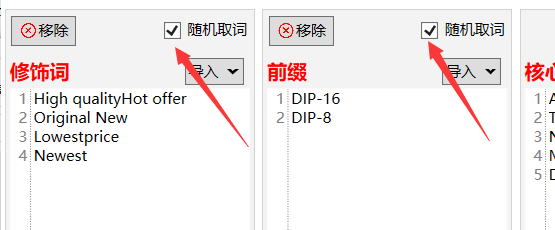 用同样的方法把要用来组合的其他词列表粘贴进来,如前缀,修饰词,后缀等。