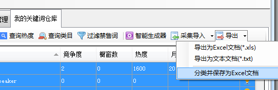 选中要导出的关键词点击导出,然后选择分类并保存为Excel文档