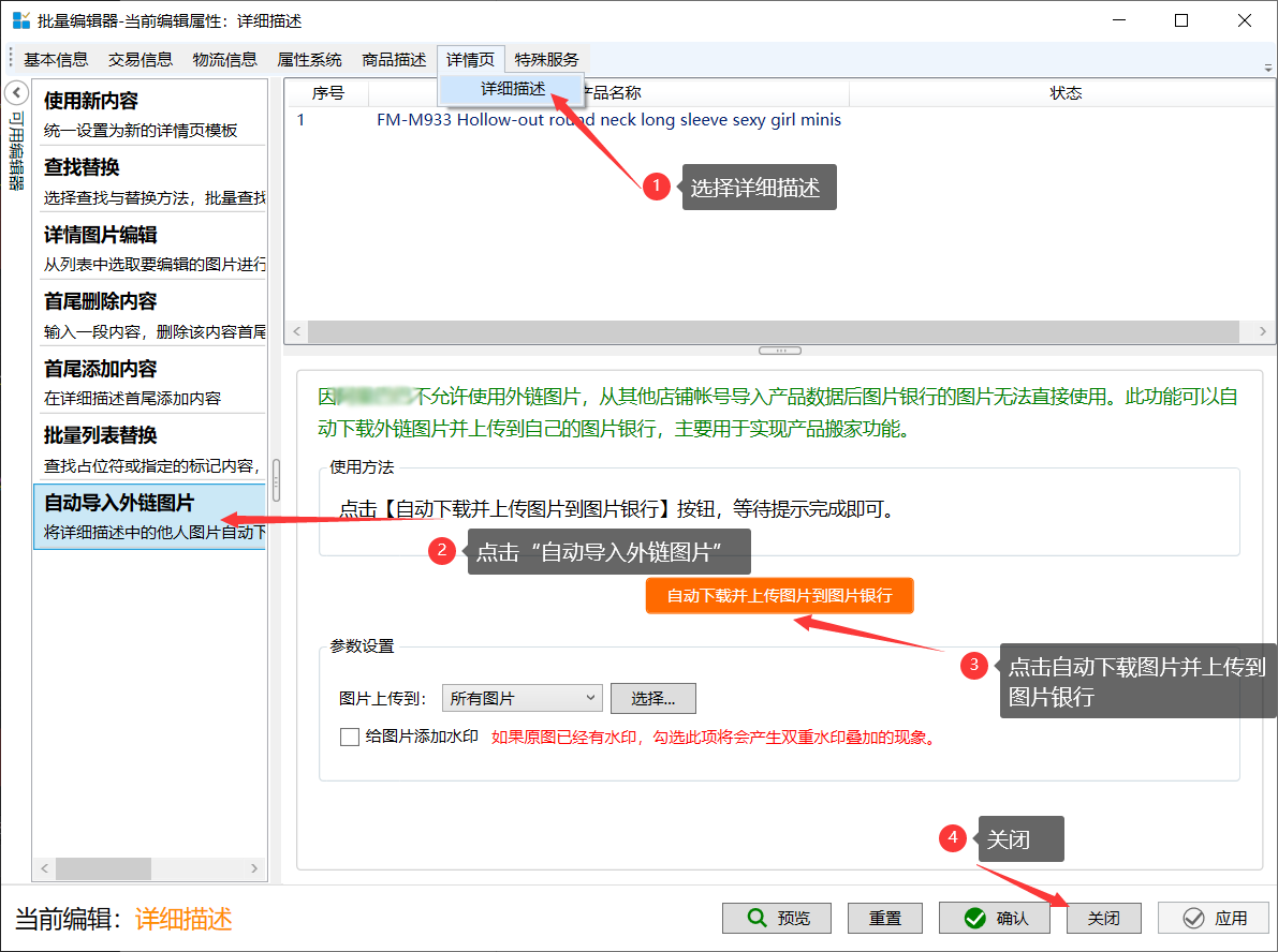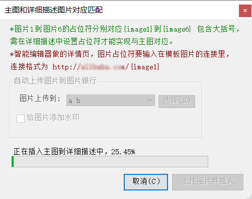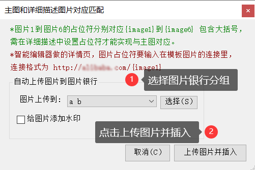 想在详细描述中插入主图中对应的图片,如把主图中第1张和第3张分别放在型号下面显示,那么在型号占位符的下方分别输入{image1}和{image3}